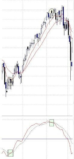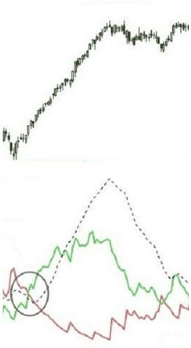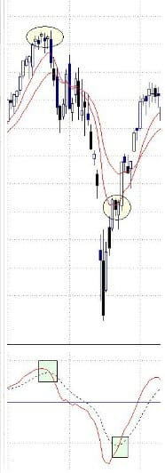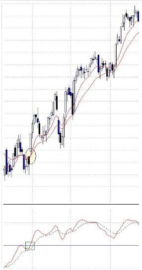 – Sistema rápido: aquí ya no se tiene en cuenta la línea central. Daría señal de compra cuando la línea continua y la línea discontinua se cortan hacia arriba. La señal de venta sería cuando la línea continua y la línea discontinua se cortan hacia abajo.