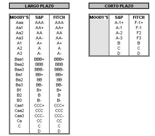 En la siguiente tabla podemos ver los tipos de rating de cada una de las tres agencias de calificación.